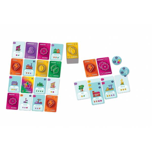 Point City, conçu par les créateurs de Salade 2 points, est un jeu axé sur l’engine building, l’acquisition de ressources et la réalisation de combos, le tout accessible à un large public. Érigez des cartes Bâtiments parmi une sélection de plus de 150 cartes de construction uniques pour étendre votre cité et accumuler le plus grand nombre possible de points.